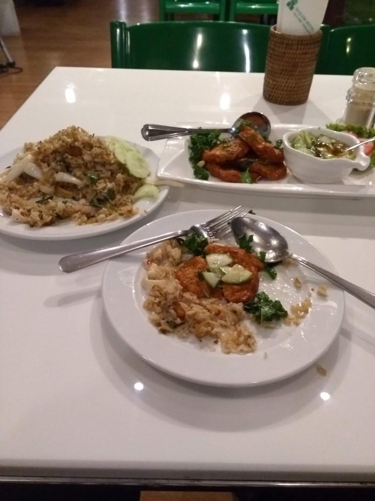 Hotel restaurant was quite lively yesterday so had tea/dinner there. Spicy seafood fried rice (prawn, squid, mussels, clams) and some Thai fishcakes.