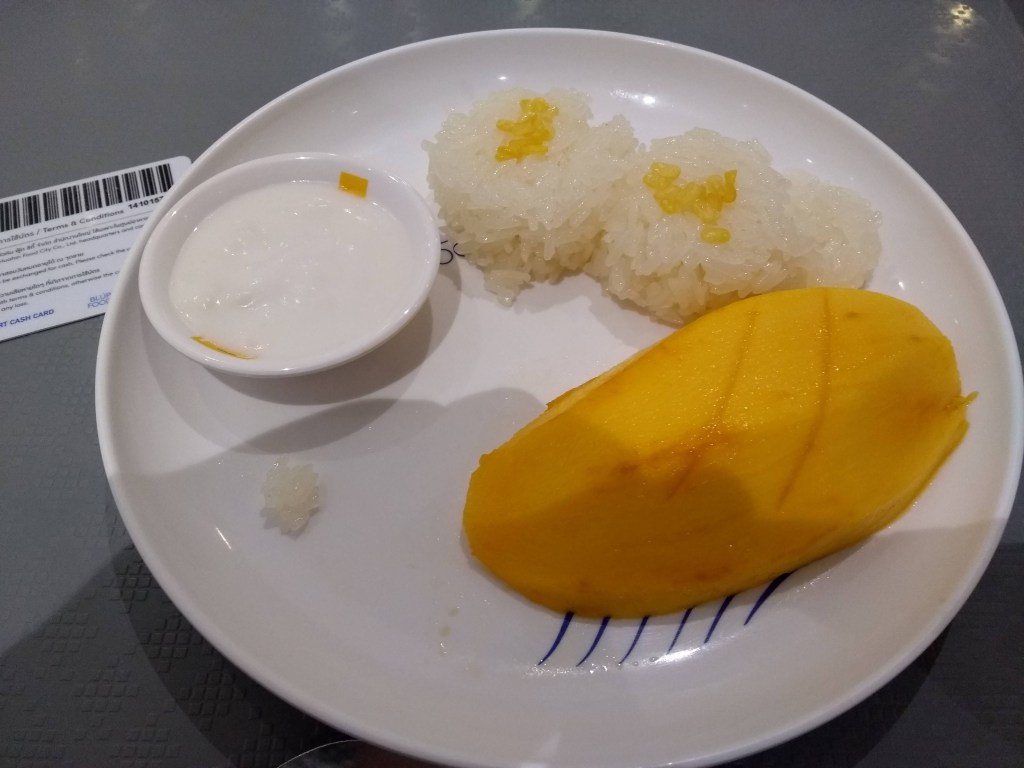 Had roast duck, roast pork and crispy pork belly with rice in some kind of gravy for £1.56, also came with a small bowl of broth which was tasty. I think the dark sauce was Hoi Sin with green chilli. Was sweet but not very spicy. Mango and sticky rice with coconut cream sauce for afters, my favourite (one of many) £1.20 for the dessert.