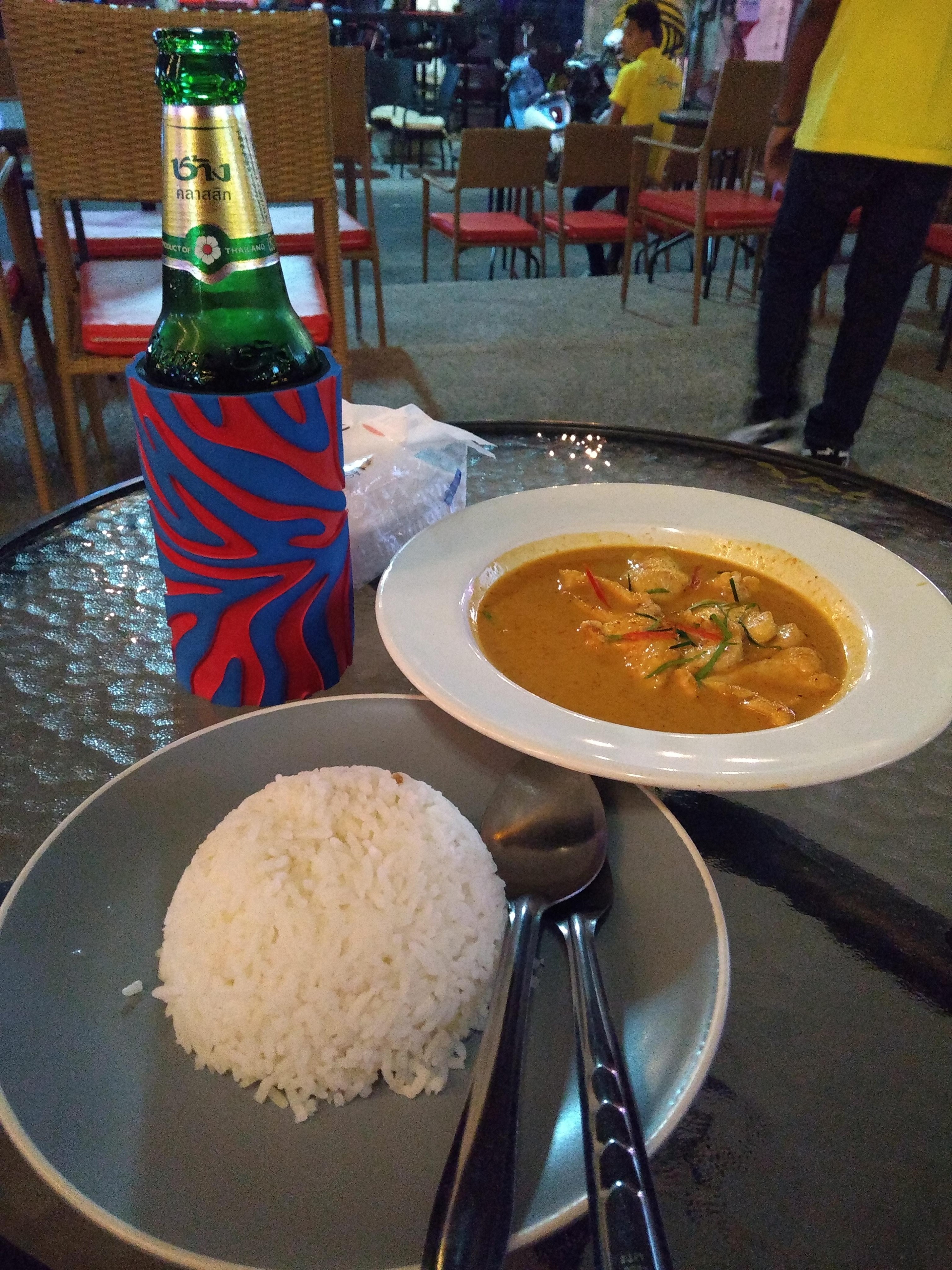 Had dinner at a local Thai place in town, Panang curry. It was spicy, salty and sweet but no nuttiness as there is supposed to be. Could taste the lime in the curry sauce though. Also no veg in the curry, I think they were cutting corners. £3.50 with the beer.