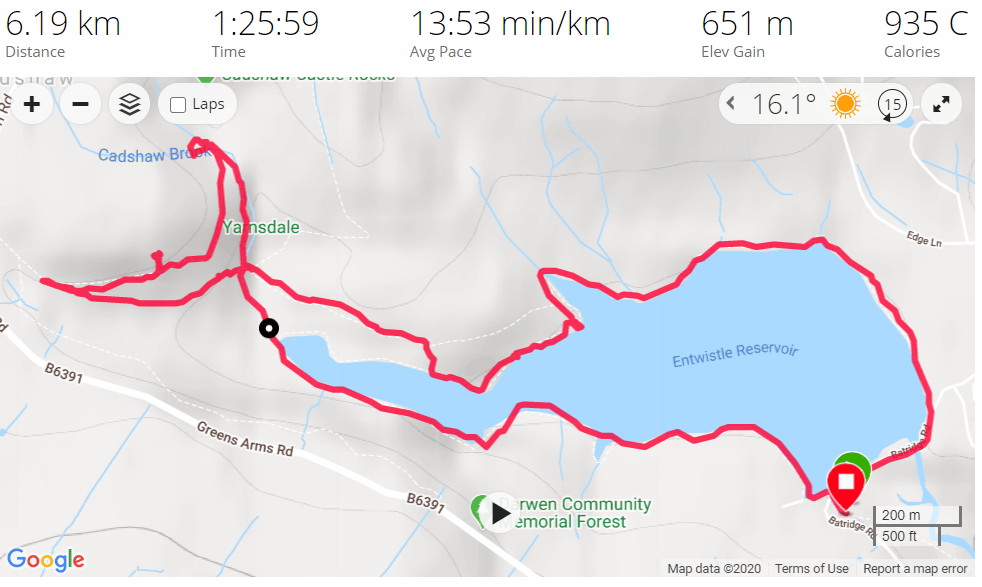Metrics as recorded by Garmin Vivoactive 3, nice walk around the reservoir with a brief walk up to the cliffs above. Couple of breaks for water etc on the way around.